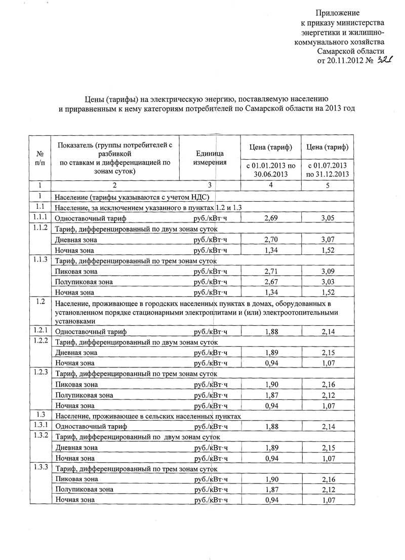 (Приказ министерства энергетики и жилищно - коммунального хозяйства Самарской области от 20.11.2012 г. №321 "Об установлении цен (тарифов) на электрическую энергию, поставляемую населению и приравненным к нему категориям потребителей по Самарской области на 2013 год") (полный текст Приказа доступен здесь)